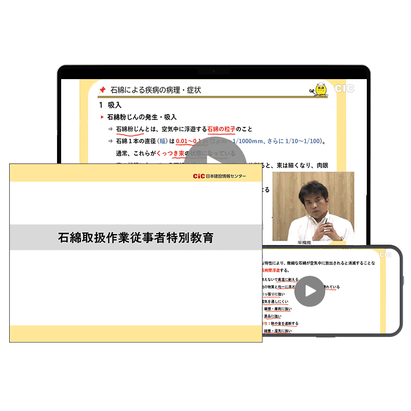 CICの講座は、石綿使用建築物等解体等業務特別教育規程に定められているカリキュラム・内容になっており、関係法令の内容、基準を満たしています。