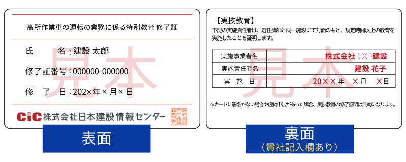 貴社にて実技実習後、弊社CICよりお送りしたカード型の『学科修了証』の裏面に実技実施日などを記入する署名欄がございますので、そちらに貴社の実技実施責任者(例:特別教育修了者、実務経験者など)から署名をいただくことで、学科+実技が修了していることの証明が可能です。