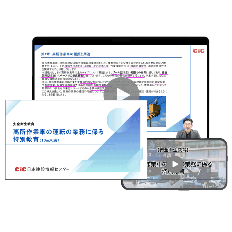 CICの講座は、労働安全衛生規則第36条第31項(高所作業車の運転業務に係る安全衛生特別教育)に定められているカリキュラム・内容になっており、関係法令の内容、基準を満たしています。