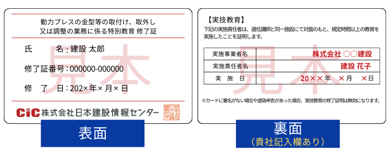 貴社にて実技実習後、弊社CICよりお送りしたカード型の『学科修了証』の裏面に実技実施日などを記入する署名欄がございますので、そちらに貴社の実技実施責任者(例:特別教育修了者、実務経験者など)から署名をいただくことで、学科+実技が修了していることの証明が可能です(オプションでカード型修了証をご選択いただいた方)。