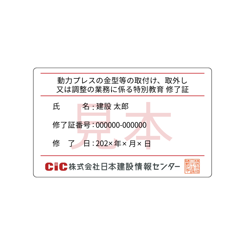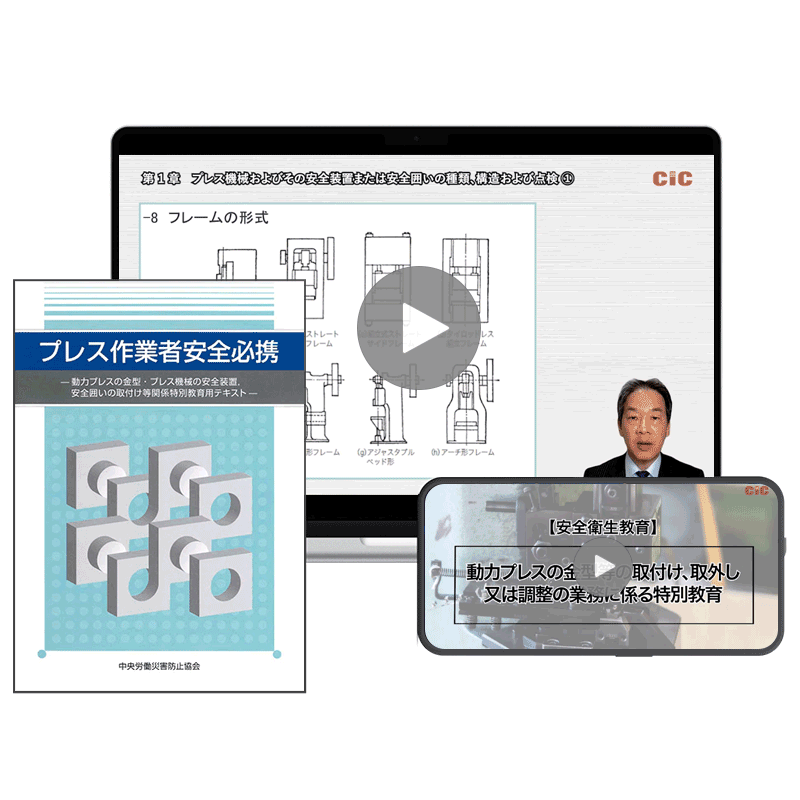 CICの講座は、労働安全衛生法第59条第3項(動力プレスの金型等の取付け、取外し又は調整の業務に係る特別教育)に定められているカリキュラム・内容になっており、関係法令の内容、基準を満たしています。