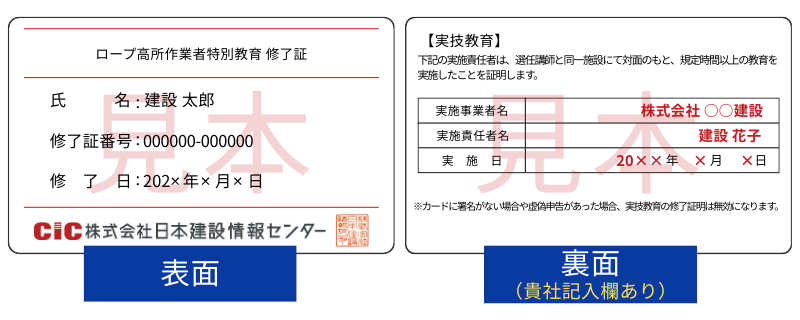 貴社にて実技実習後、弊社CICよりお送りしたカード型の『学科修了証』の裏面に実技実施日などを記入する署名欄がございますので、そちらに貴社の実技実施責任者(例:特別教育修了者、実務経験者など)から署名をいただくことで、学科+実技が修了していることの証明が可能です(オプションでカード型修了証をご選択いただいた方に限ります)。