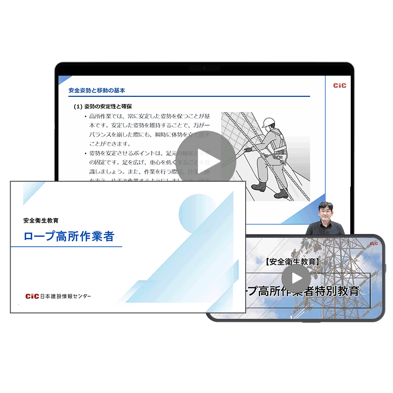 CICの講座は、安全衛生特別教育規程 第二十三条(ロープ高所作業に係る業務に係る特別教育)に定められているカリキュラム・内容になっており、関係法令の内容、基準を満たしています。