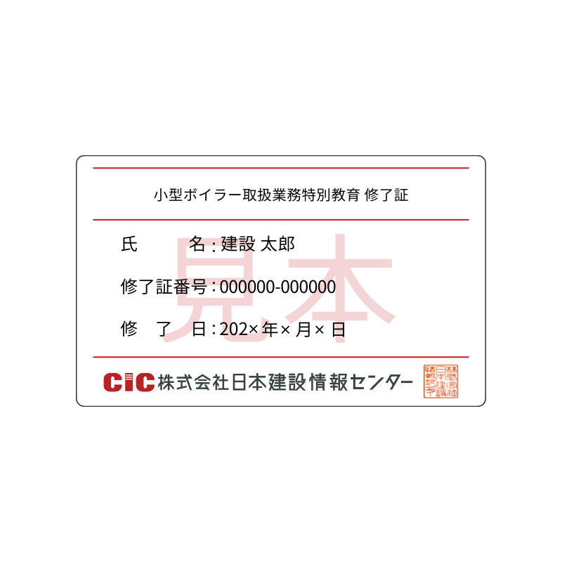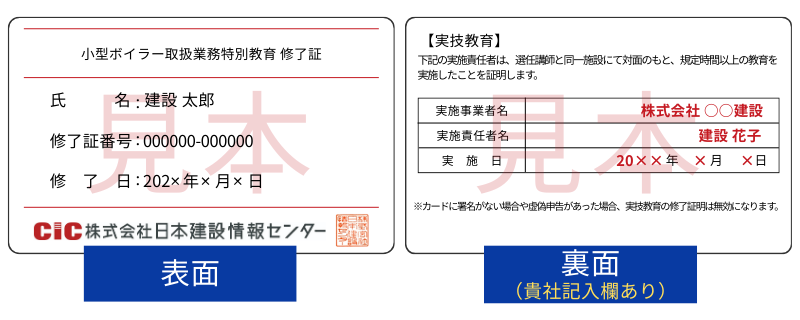 貴社にて実技実習後、弊社CICよりお送りしたカード型の『学科修了証』の裏面に実技実施日などを記入する署名欄がございますので、そちらに貴社の実技実施責任者(例:特別教育修了者、実務経験者など)から署名をいただくことで、学科+実技が修了していることの証明が可能です。