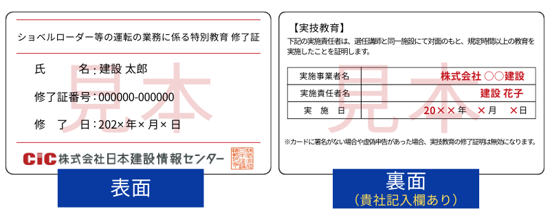 貴社にて実技実習後、弊社CICよりお送りしたカード型の『学科修了証』の裏面に実技実施日などを記入する署名欄がございますので、そちらに貴社の実技実施責任者(例:特別教育修了者、実務経験者など)から署名をいただくことで、学科+実技が修了していることの証明が可能です(オプションでカード型修了証をご選択いただいた方に限ります)。