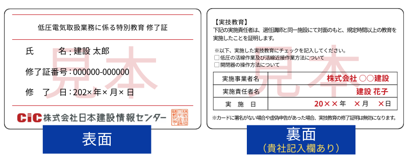 貴社にて実技実習後、弊社CICよりお送りしたカード型の『学科修了証』の裏面に実技実施日などを記入する署名欄がございますので、そちらに貴社の実技実施責任者(例:特別教育修了者、実務経験者など)から署名をいただくことで、学科+実技が修了していることの証明が可能です(オプションでカード型修了証をご選択いただいた方)。