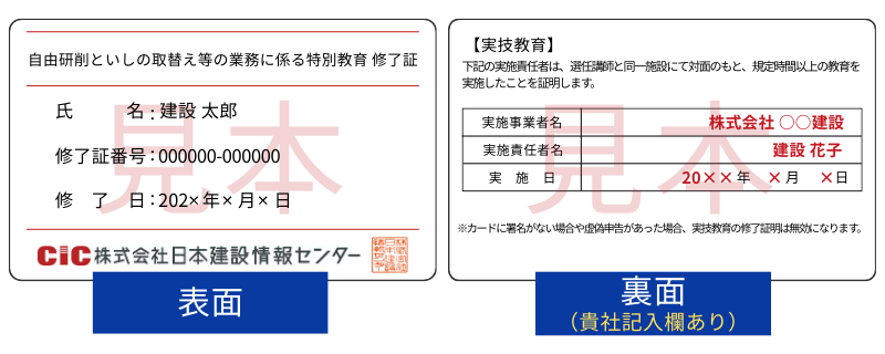 貴社にて実技実習後、弊社CICよりお送りしたカード型の『学科修了証』の裏面に実技実施日などを記入する署名欄がございますので、そちらに貴社の実技実施責任者(例:特別教育修了者、実務経験者など)から署名をいただくことで、学科+実技が修了していることの証明が可能です(オプションでカード型修了証をご選択いただいた方に限ります)。
