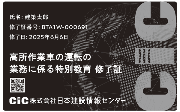 高所作業車の運転の業務に係る特別教育 修了証とは、高所作業車運転業務に従事するすべての作業員が受講すべき特別教育を受講し、修了していることを証明するのです。