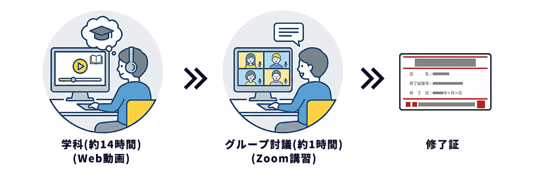 本講座は、学科(Web動画)約14時間とグループ討議(Zoom講習)約1時間がセットになった通信用教育コースです。