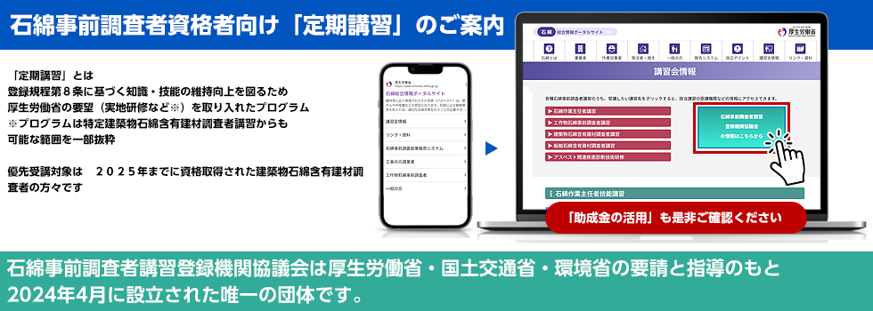 建築物石綿含有建材調査者取得済の方に向けた定期講習開催のお知らせ(主催:石綿事前調査者講習登録機関協議会)