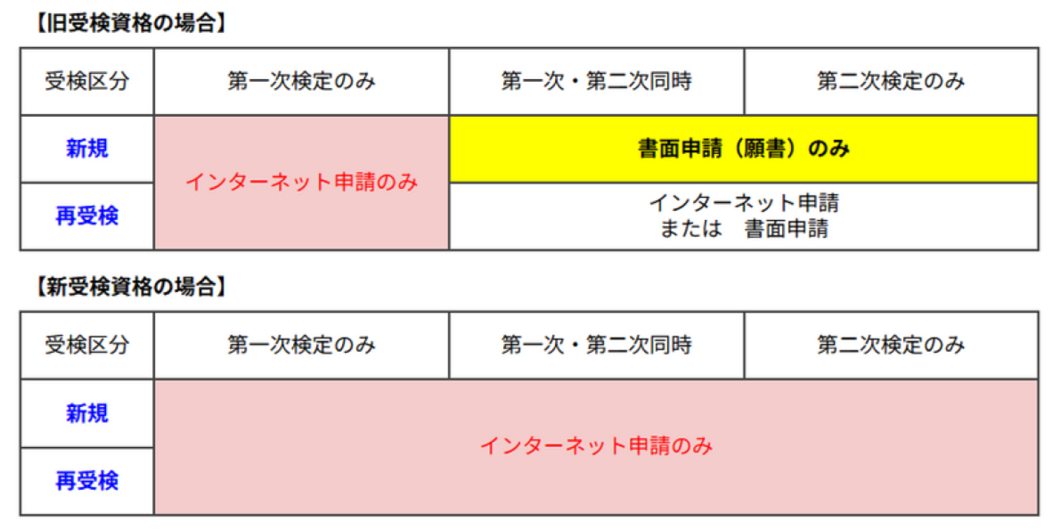 令和8年度の試験より、新受検資格での受検申請(新規・再受検)は、原則としてインターネット申請のみに変更となります。 経過措置として利用可能な「旧受検資格」とは申請方法が異なるため、ご自身の受検資格に合わせて準備が必要です。